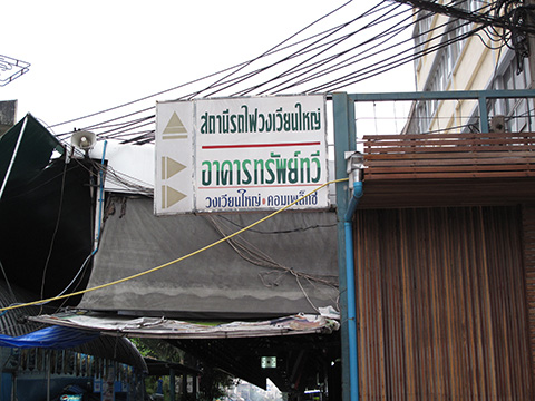 狭い歩道に露店がひしめき合うなかを進むとローカルなショッピングセンター風の建物の脇のソイに『△ウォンウィエンヤイ駅』とタイ語で書かれた書かれた案内板を発見。