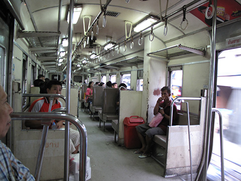 外国人の多いカンチャナブリー行きは言うに及ばず、観光に出かける風のタイ人のいたチャチュンサオ行きに比べてもローカル度はかなり高く、ウォンウィエンヤイのタラートで買出ししてきたらしきおばちゃんや沿線に住んでいる学生、ちょっと街まで出てきた風のおっさんたちばかり。