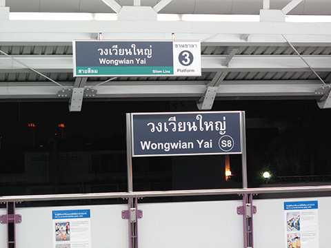 狭い歩道に露店がひしめき合うなかを進むとローカルなショッピングセンター風の建物の脇のソイに『△ウォンウィエンヤイ駅』とタイ語で書かれた書かれた案内板を発見。