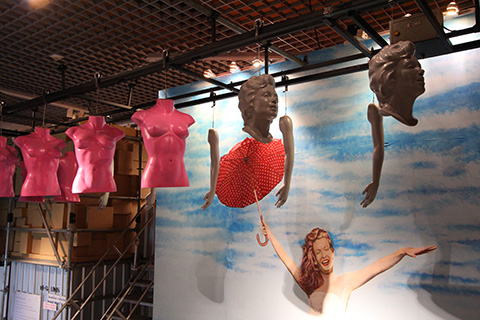 天井には上半身だけ、下半身だけ、腕だけのマネキンがつるされて生産現場のようにぐるぐる回っている。