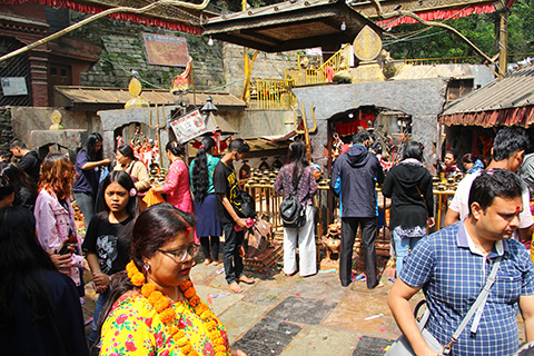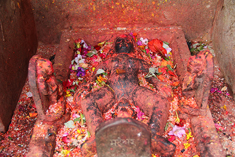 丘から下を見下ろす場所にある、この街を象徴するバグ・バイラヴ寺院には出産中の生々しい姿の女神像が祀られていてこれは珍しい。