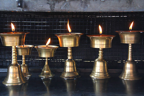 本殿の前にはチベット仏教の影響を受けているらしいパターランプが並べられていた。