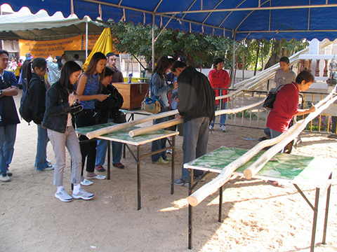 ある人は長く黄色い布に何かを書き込み、ある人は白く塗られて先が二つに分かれた長さ5mほどの木に書き込んでいる。