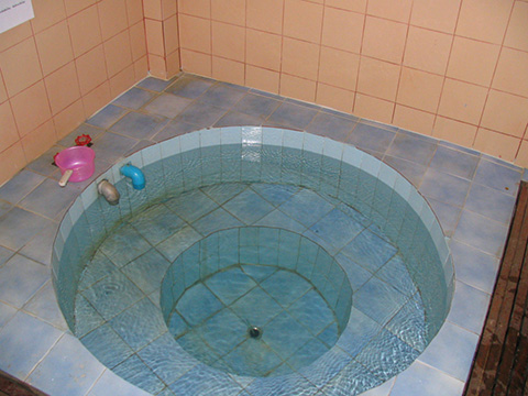 にいちゃんに個室の鍵を開けてもらうとそこは4畳半くらいの広さのスペースに2段重ねの円筒を逆向きにして彫ったような湯船とシャワー、洗面台があった。