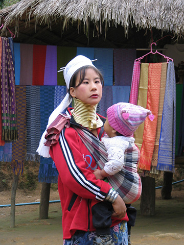 ここは1本の道に沿って両側に小屋が並び今までの村と同じように土産物類を売っているが、今までとだいぶ違うのはその小屋々々で首長族の女性たちがまるで動物園の動物達のように見世物になっていることである。