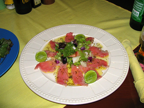まず手始めにミックスサラダとツナのカルパッチョを頼むと30cmはあろうかと思われるオリーブオイルの瓶と同じくらいの大きさのペッペーミル、それにこちらは普通サイズのヴィネガーがやってきてなんか気合いを感じさせた。