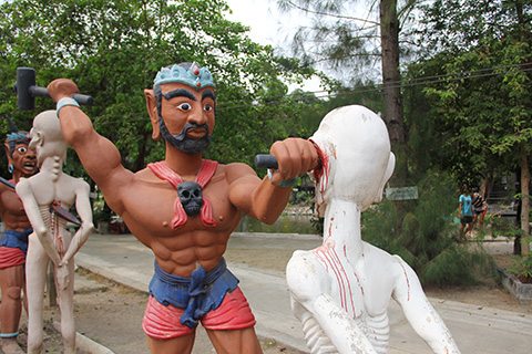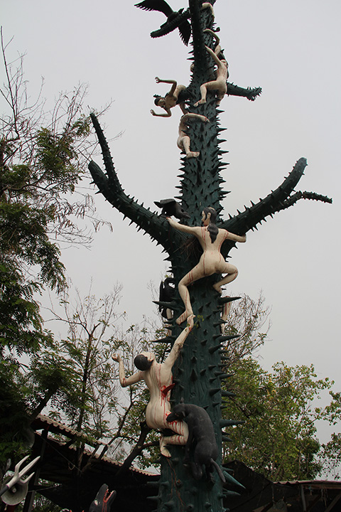 池にかけられた橋を渡って門をくぐると鳥についばまれている人々やトゲトゲの木に登らされている人々が目に飛び込んできた。