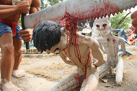 耳に杭を打ち込まれたり首を鋸でひかれているのは痛そうだ。