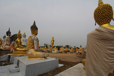 敷地に入っていくと金色の立仏像をはさんで両側に何列にも並ぶ大小さまざまなそれらの座仏像の台座には人の写真が貼られ名前が書かれていた。