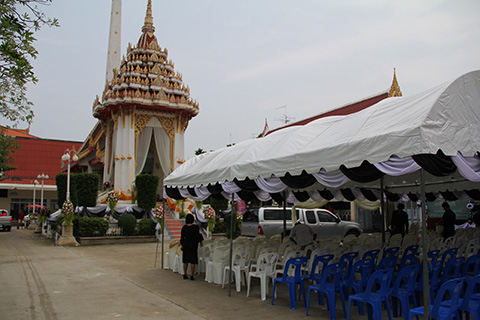 門をくぐって境内に入っていくと正面にはウボーソット(本堂)、右手にはウィハーン(礼拝堂)が建っておりウィハーンの前では葬儀が行われていた。