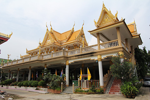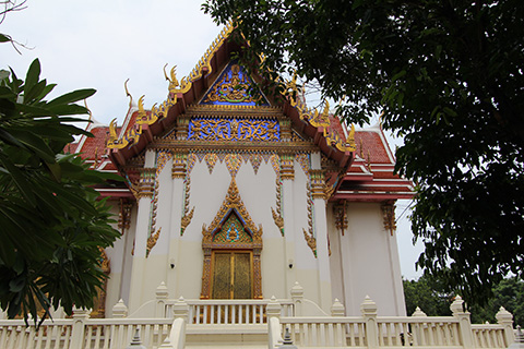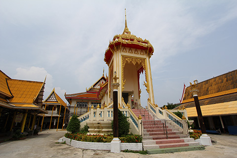 奥のほうにあった高床式のウィハーンが特徴的で、白い壁に金細工の屋根が映えていた。