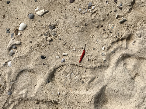 砂浜に何故かまるのままの唐辛子が一つ。