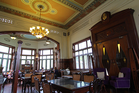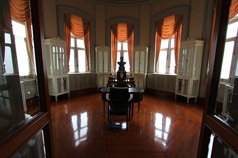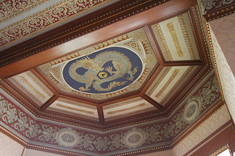 窓が何面もとられていて明るく、チーク材の床はぴかぴかに輝き、他はヨーロッパ調なのに出窓部分だけは天上に龍の絵が描かれていた。