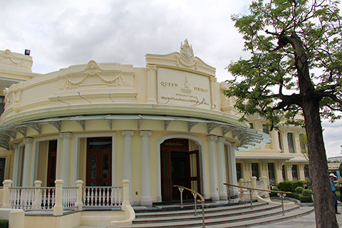 王宮エリアの出口付近にはシリキット王妃の名前を冠した、ベージュ色のテキスタイル博物館。