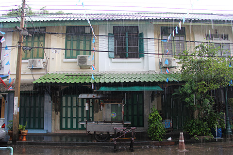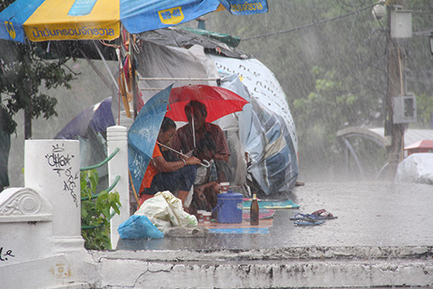 そう思いながら通りの向こうに目を移すと傘を持ってないタイ人客たちが小さな軒先で肩を寄せ合って雨宿りしていた。