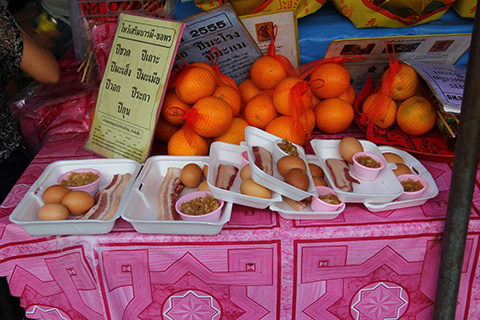 違いがあるとすれば普通は菊や蓮の花が多い周囲のお供え物売り屋台にベーコンやタマゴのセットがあったくらいだろうか。