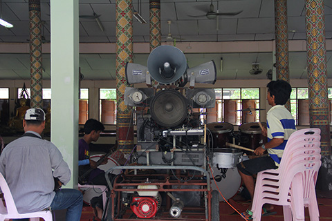 寺の建物からものすごい音量のモーラムっぽい音楽が聞こえてきている。