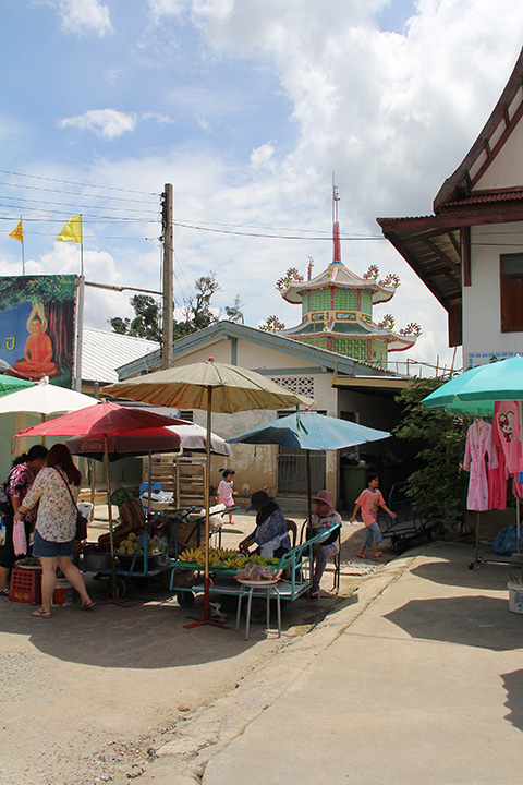 これ以外になにかあるかと付近を散策してみるが、Google mapの航空写真から期待した古そうな建物はすべて寺の屋根でそれ以外に伝統的なタラートがあるわけでもなく、唯一目を引くのは中華風な六角形の低い塔くらいなものだった。