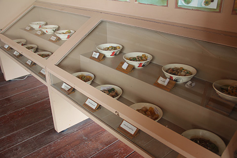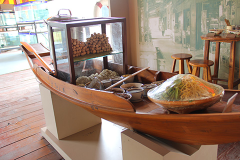 埃だらけになったクイティアオのサンプルメニューがガラスケースの中に並べられていてその脇には小舟に積まれたクイティアオルア(船ソバ)の商売セットが展示されていた。