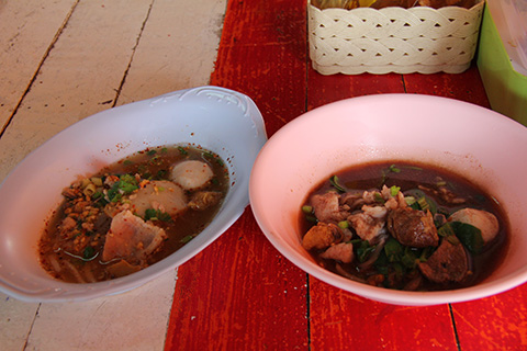頭上に掲げられた写真付きメニューを眺めると一杯それぞれが15THBだったのでいわゆる一口サイズだろうとナムトックとトムヤムと注文。