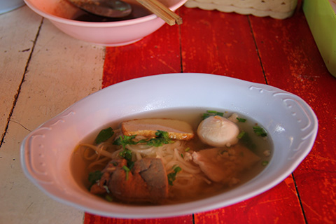いずれもコブシ半分くらいしか麺が入っていないのでナムサイを追加注文したが、こちらはスープにはほとんど味がなく自分でナンプラーやナムソムプリック(唐辛子入りの酢)で味付ける。