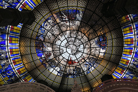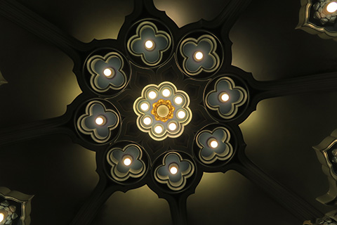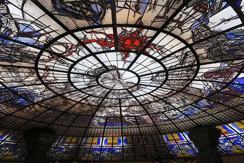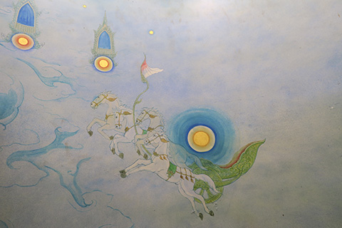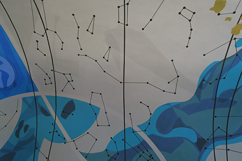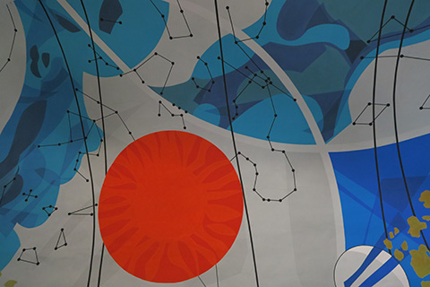 天井を見上げるとなぜこんなところに日の丸?かと思ったがどうも太陽を表しているらしく、その周りには星座も描かれていた。