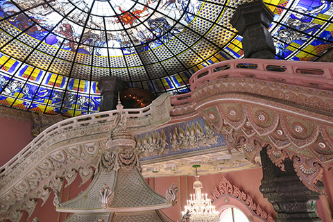 階段を登りきるとまず青空のような天井が見えてきて、部屋の奥には手前とその向こう2体の黄金の仏像が目に入ってくる。