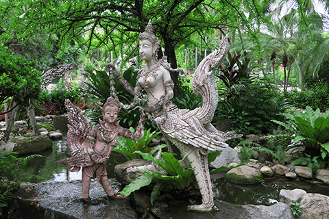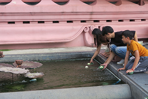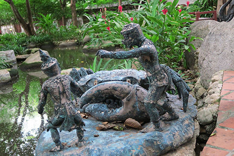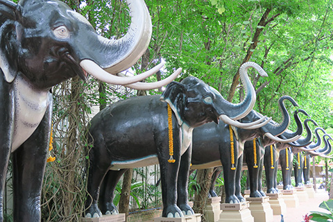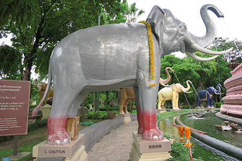 いったん外に出ると周囲は仏教公園となっており水路ではタイ人がガトーンを流してタンブン中、ぐるっと並んだ象の下をくぐるとブオーと鳴き声が聞こえた。
