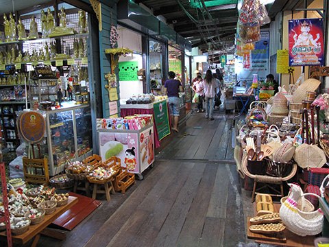寺に近いあたりは参拝客向けなのだろう、お供えセットやプラ・クルアンが目立つが川沿いを右に曲がるとお菓子やおみやげ物の店が増えてくる。