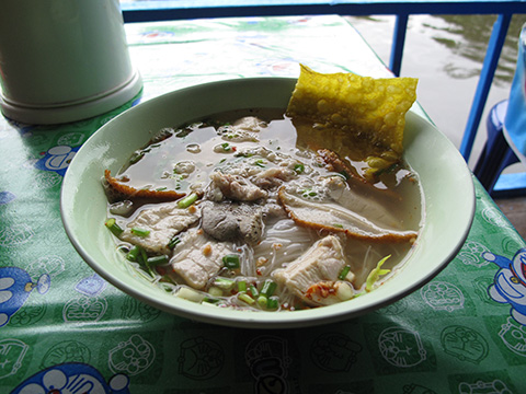 いくつかある店のうちでガラスケースに『クイティアオ・トムヤム』とあった店の女の子にそれを注文して川沿いの席に座る。
