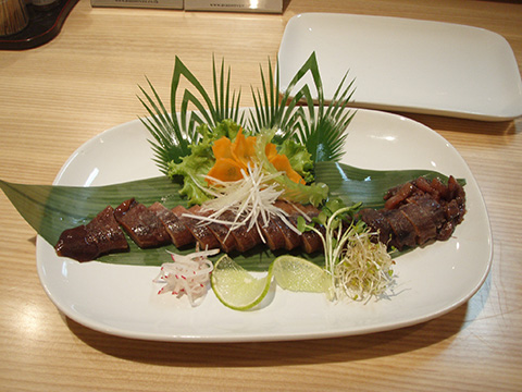これ以外にわかめとキュウリの酢の物、鯛の刺身と注文し焼酎4杯で1340THB(税・サービス料込み)。