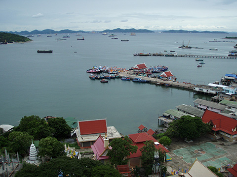 タイ随一の貿易港であるレムチャバンをひかえているせいでシラチャーの沖合いにはクレーンを備えたコンテナ船がびっしりと停泊している。