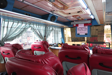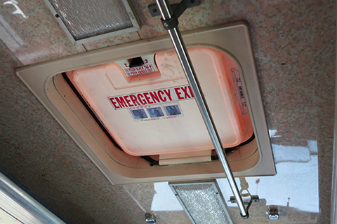 ふつう、日本のバスは後ろの方に非常口があるだろうが、そのバスはなんと天井に非常口がついていた。