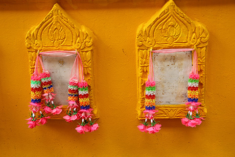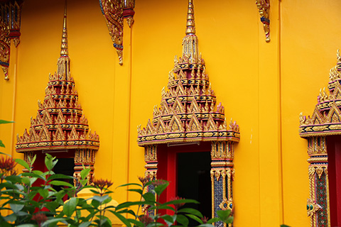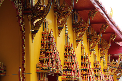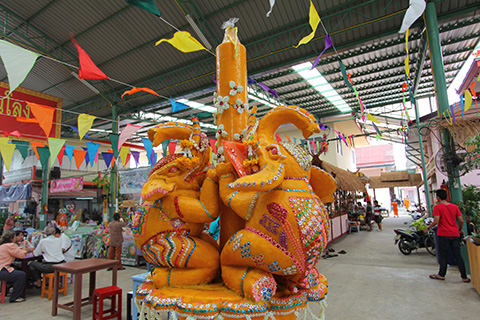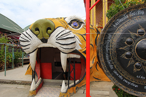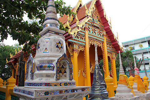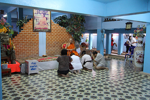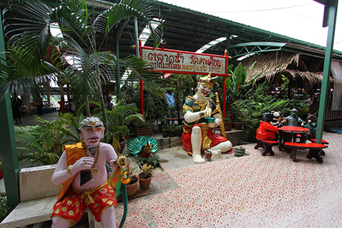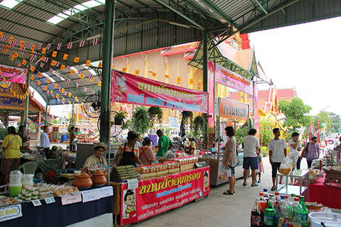 ガンチャナーピセックからナコンイン通りに入るカーブの途中にピンクっぽいマッサージ屋が並んではいたものの、ワット・タキアンはいたってふつうの寺で寺の敷地内には小規模なタラートができていた。