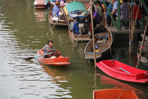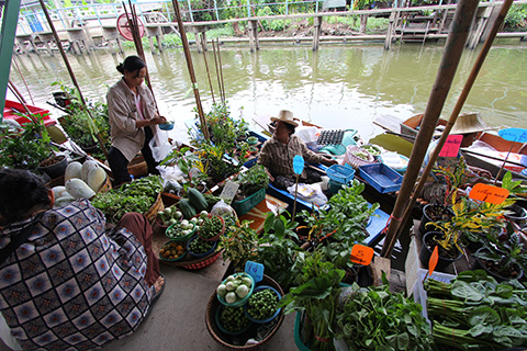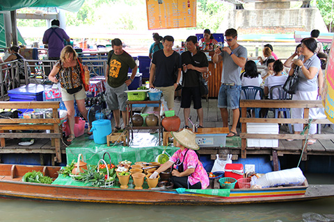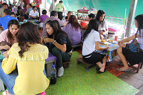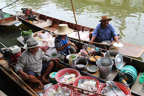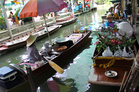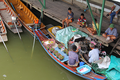 陸上にも食堂やお菓子などを売っている店があるが運河の上にも10艘ほどのボートが並びクイティアオなどおなじみの軽食を売っている。