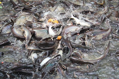 口を開けたナマズが押し合いへし合い餌を奪い合っていてたいそうグロテスク。