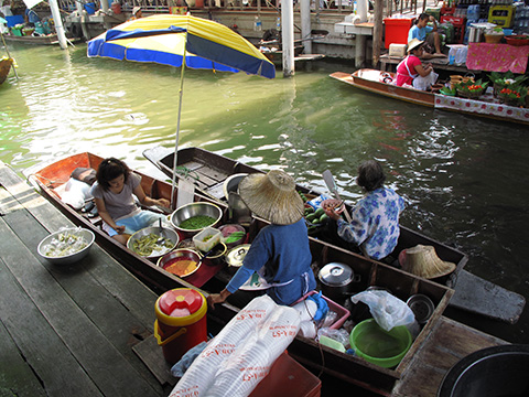 古い家並みの続くサムチュック(スパンブリー)のタラートローイピー(100年市場)やアムパワーのようなものを勝手に想像していたのだが、川沿いにあるのは2軒の食堂だけで、その手前の狭い水場に5、6艘の小舟が並び観光客に食べ物を売っている。