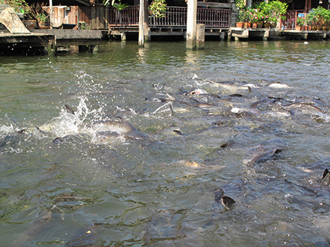 単なる楽しみなのかそれともタンブンなのか、タイの水辺の観光地ではこのように魚に餌をやることが当たり前らしい。