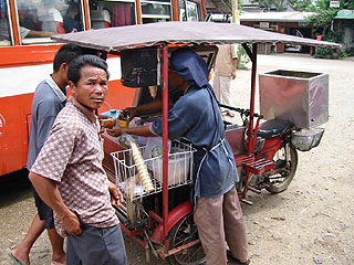おばちゃんの作ってくれたクイッティアオヘーン(15THB)を食べ終えてバイクにまたがり走り始めると『オーイ』と誰かの呼ぶ声が聞こえた。