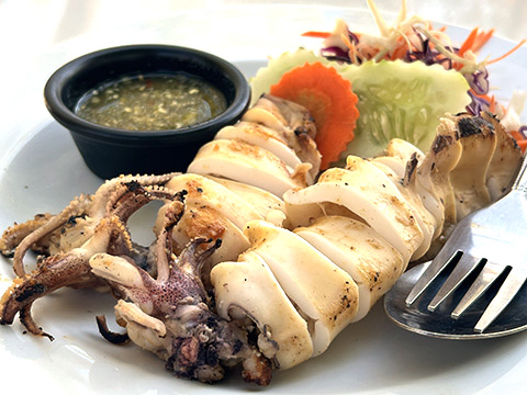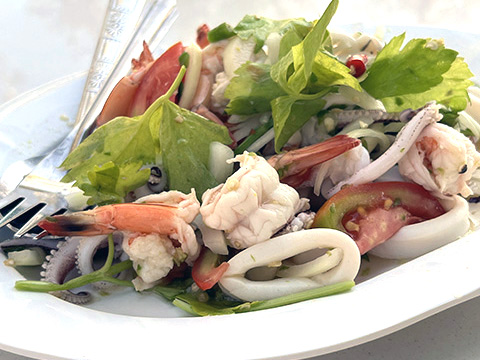 取り敢えずホテルのレストランで昼ビールと遅めの昼飯はヤムタレー(激辛シーフードサラダ)とムックヤーン(イカ焼き)。