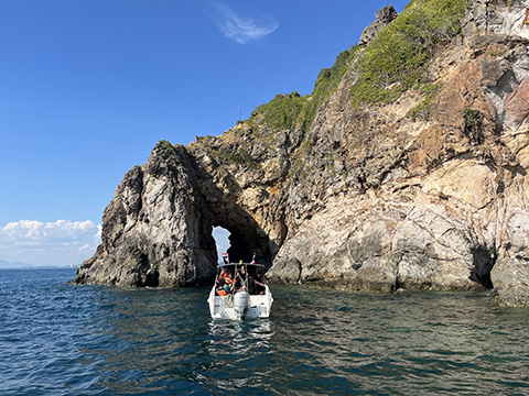 「ここはあの穴の中に泳いで入っていける」とガイドが説明している。