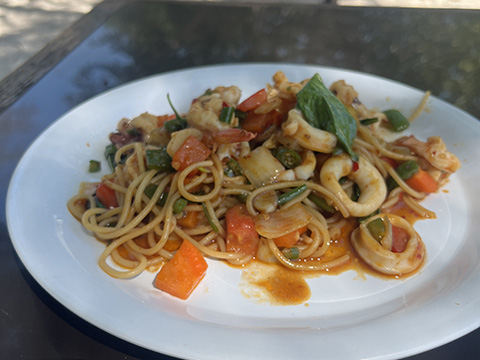 メニューにはなかったけどスパゲッティがあるならできるだろうと(この辺りが気軽なタイ)スパゲッティパッキーマオタレーを注文。