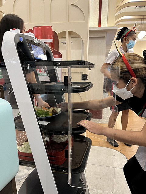 MKはIT化導入が早く、タブレットでの注文もいち早く導入されていたが、今は配膳がロボット化され料理を乗せ音楽を鳴らしながら店内を縦横無尽に動き回っている。