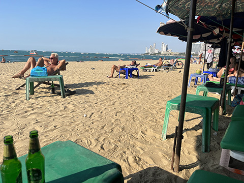 アンブレラの下のチェアーを確保し、ビアチャーンを注文。