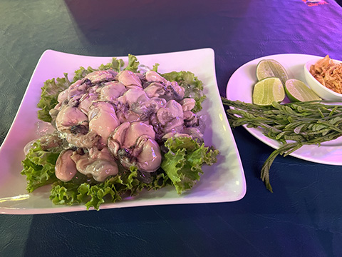 貝殻付きの生牡蠣は売り切れだそうでむき身のもの(300THB)を頼んだら水っぽくて味なし。