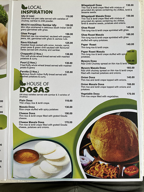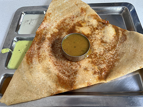。いつものおっさんが「スペシャルミールスとソルトラッシーか?」とやって来たけど今日はchettinad spicy masala cheese dosaにしようと決めていたのでそれを注文。