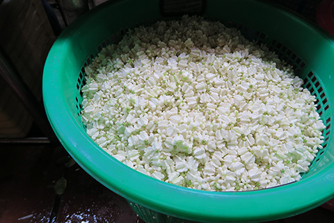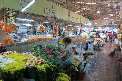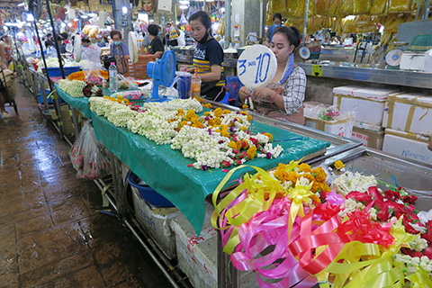 こちらは車のバックミラーにぶら下げていたりあちこちの施設の敷地内にある祠にささげられていたりするプアンマーライや、お寺に献花する材料の花などを扱っている24時間営業の生花市場。