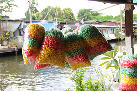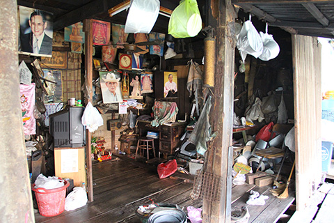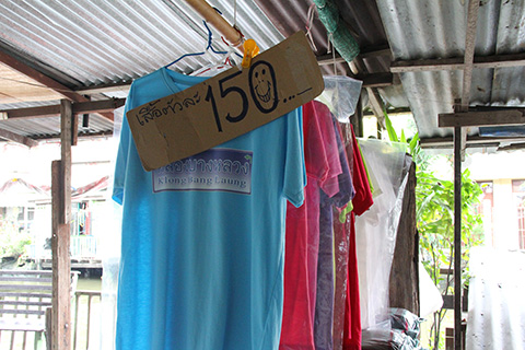 多少は観光客を意識しているのか、バーンルアンと書かれたTシャツがぶら下がっていたり、タンブン用の魚のえさが売られている以外は、雑貨屋や開け放たれ散らかったままの民家が並んでいるくらい。