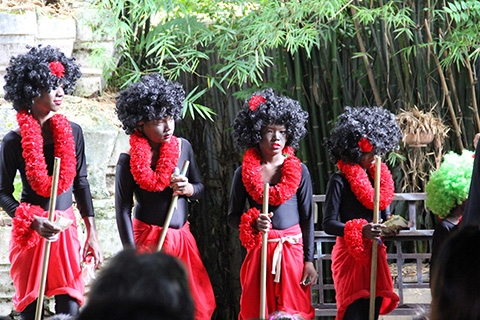 びっしりと人が座りこんでなにやら前をほうを見ていたので覗いてみると、その先に黒い長袖シャツ、赤い腰巻に身を包み、顔を黒く塗ってアフロヘアー姿の子供たちが司会役の男性からインタビューを受けているところ。