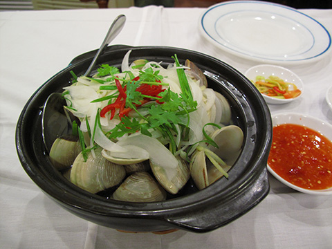 ハマグリの酒蒸し、酒抜き(?)+ショウガ、タマネギ、パクチー入り。